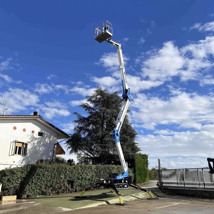 Sie erreicht eine maximale Arbeitshöhe von 23,80 m und eine maximale seitliche Reichweite von 11 m bei einer Tragfähigkeit von 230 kg (2 Bediener + Material). 380° Turmdrehung, der bewegliche Korbarm und der Doppelgelenkausleger ermöglichen bestmögliche Manövrierfähigkeit.